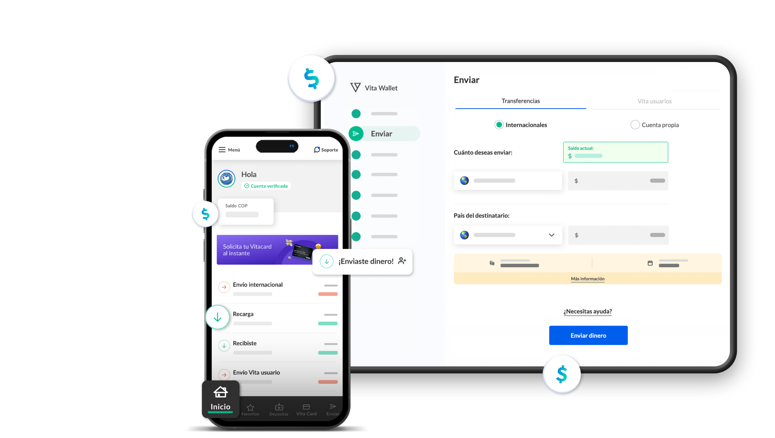Sin importar donde estés, con tu Vita Wallet podrás transferir desde Colombia a más de 190 destinos, o recibir dinero internacional sin largas esperas, mucho más rápido y sencillo que antes. Solo necesitas el número de cuenta o correo electrónico.