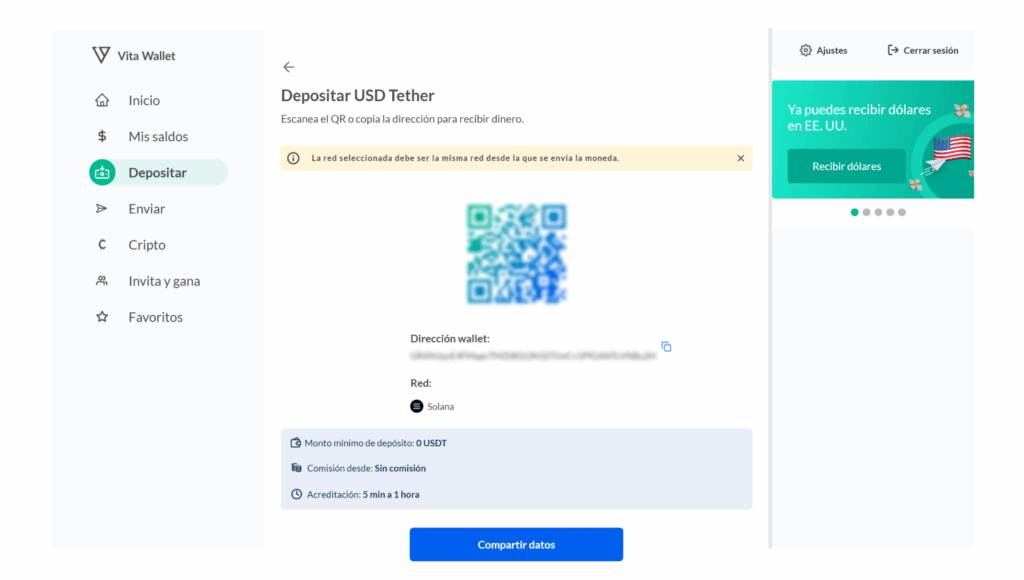 Explora las redes disponibles para enviar y recibir USDT en Vita Wallet