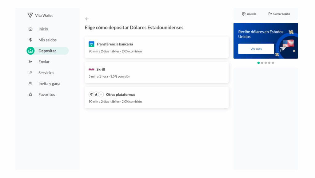 3️⃣ Empieza a cobrar. Recibe pagos de Estados Unidos y mándalos de forma local a tu cuenta en Vita Wallet. ¡Los fondos llegan entre 1 a 3 días hábiles!