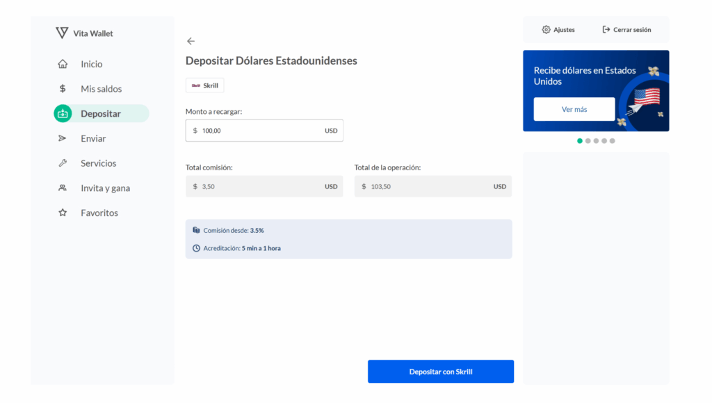 Para hacer tu experiencia más sencilla, consolidamos las opciones de ‘Recibir’ y ‘Recargar saldo’ en un solo lugar. Encuentra todo lo que necesitas en el apartado ‘Depositar‘ de tu Vita Wallet. En este tutorial te enseñamos cómo depositar dólares con Skrill en México.