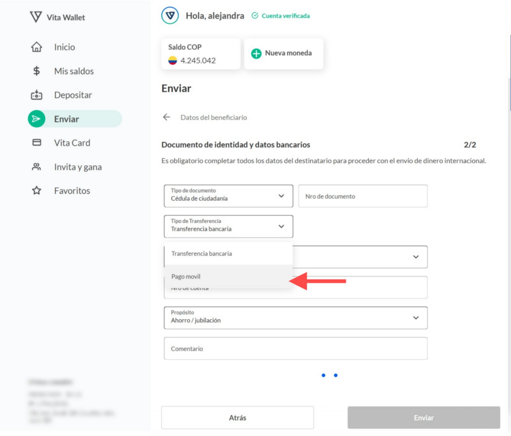 Paso a paso para enviar dinero desde Vita Wallet
