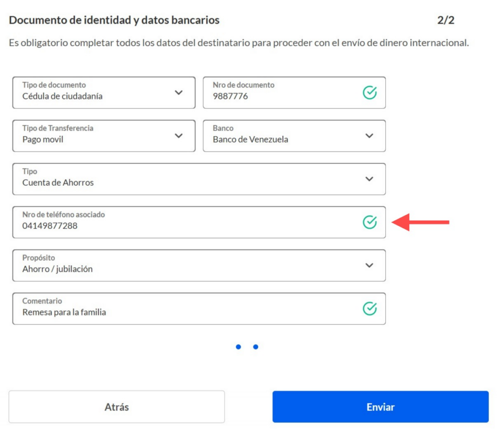 - Seguidamente, Completa el formulario con los Datos del destinatario, Número de teléfono (con el indicativo correcto), Documento de identidad y datos del banco receptor.