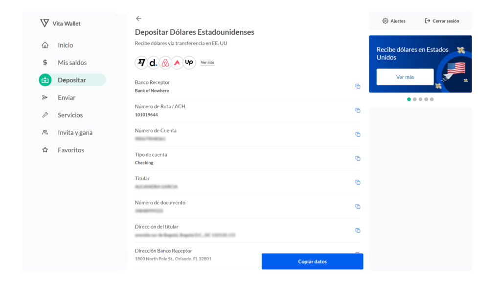 En caso desees recibir de plataformas externas, dale clic a esa opción y podrás ver todos los datos que debes ingresar en tus plataformas preferidas para transferirte los fondos en dólares directo a tu Vita Wallet. ¡No te cobramos ni un dólar por recibir!