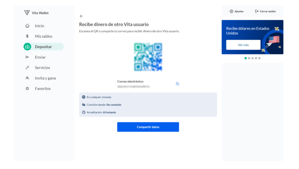 - Una vez que selecciones Depósito entre Vita Usuarios, podrás ver tu QR y correo registrado en Vita Wallet. Compártelo con tus contactos para que te puedan enviar dinero sin comisiones y de inmediato.