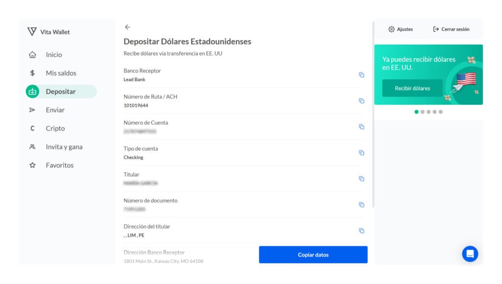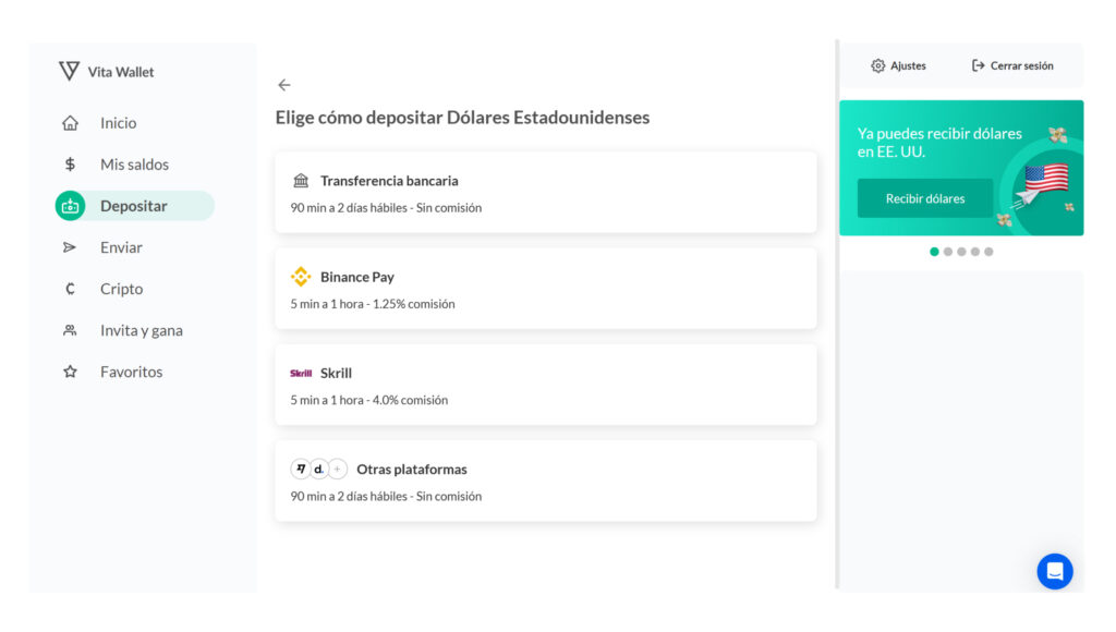 Recibe pagos en dólares en tu cuenta de Vita Wallet desde el apartado ‘Depositar’