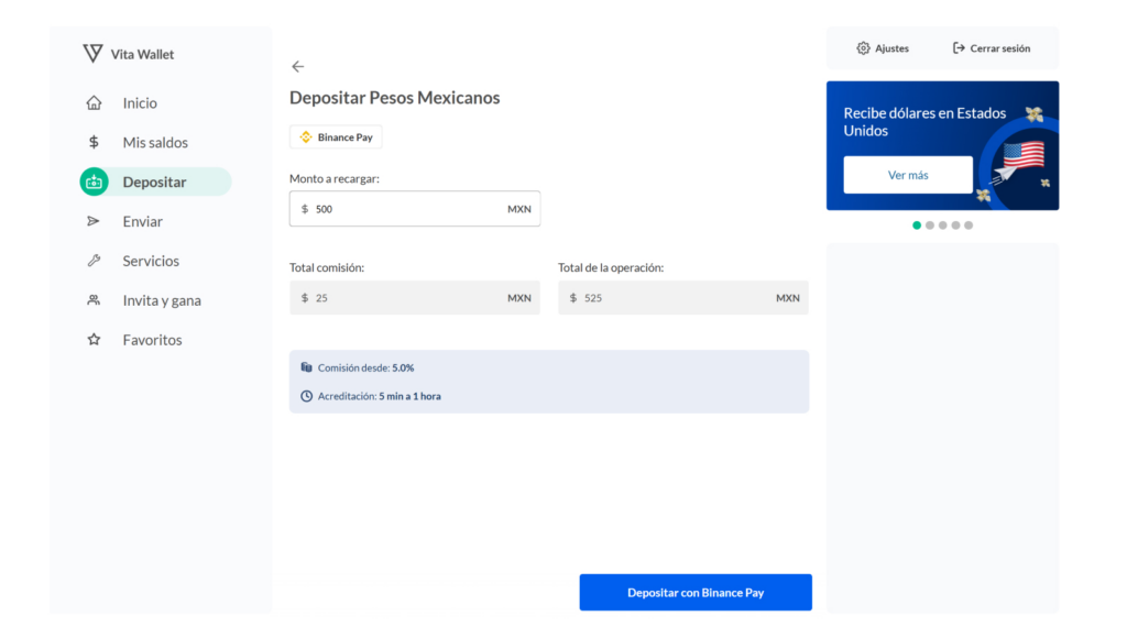 4️⃣ Después de confirmar tu operación vuelve a la app de Vita Wallet. Verás tus fondos reflejados en pesos mexicanos en tu cuenta.