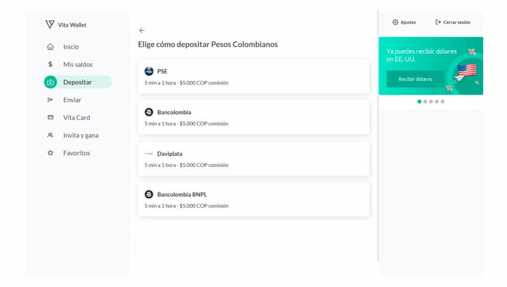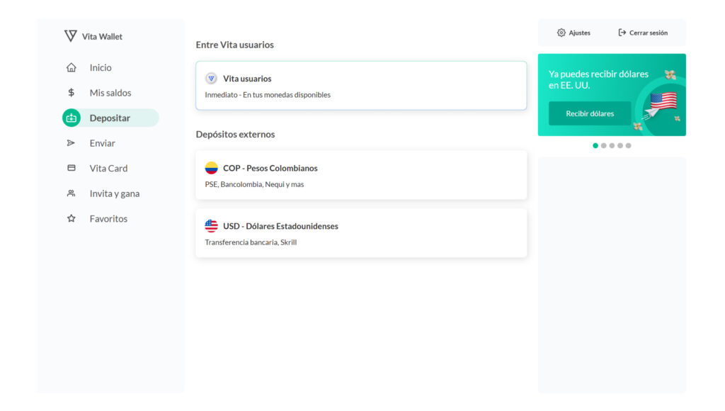 - Claridad: Encuentra fácilmente si quieres recibir de otro Vita usuario o hacer un depósito externo (en tu moneda local, USD, o criptos como USDT, BTC, USDC, según disponibilidad por país).