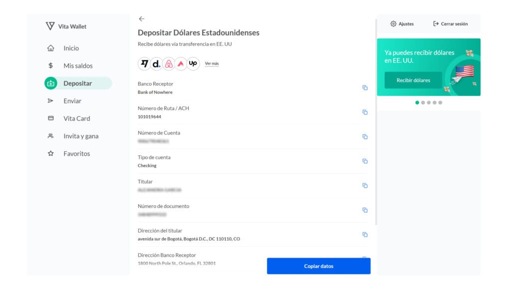 En caso desees recibir de plataformas externas, dale clic a esa opción y podrás ver todos los datos que debes ingresar en tus plataformas preferidas para transferirte los fondos en dólares directo a tu Vita Wallet. ¡No te cobramos ni un dólar por recibir!