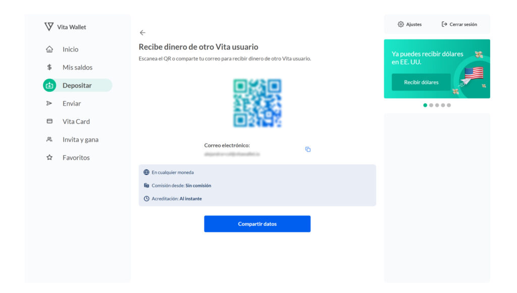 - Una vez que selecciones Depósito entre Vita Usuarios, podrás ver tu QR y correo registrado en Vita Wallet. Compártelo con tus contactos para que te puedan enviar dinero sin comisiones y de inmediato.