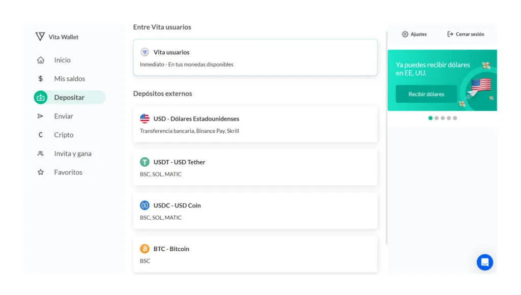 - Claridad: Encuentra fácilmente si quieres recibir de otro Vita usuario o hacer un depósito externo (en tu moneda local, USD, o criptos como USDT, BTC, USDC, según disponibilidad por país).