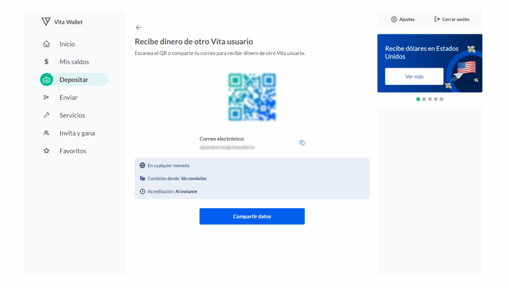 - Una vez que selecciones depósito Entre Vita Usuarios, podrás ver tu QR y correo registrado en Vita Wallet.