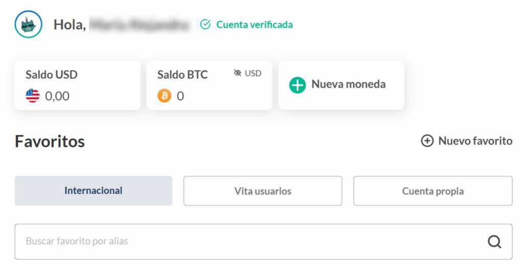 1️⃣ Inicia sesión en Vita Wallet con tu correo verificado y dirígete a la sección Favoritos (columna izquierda).